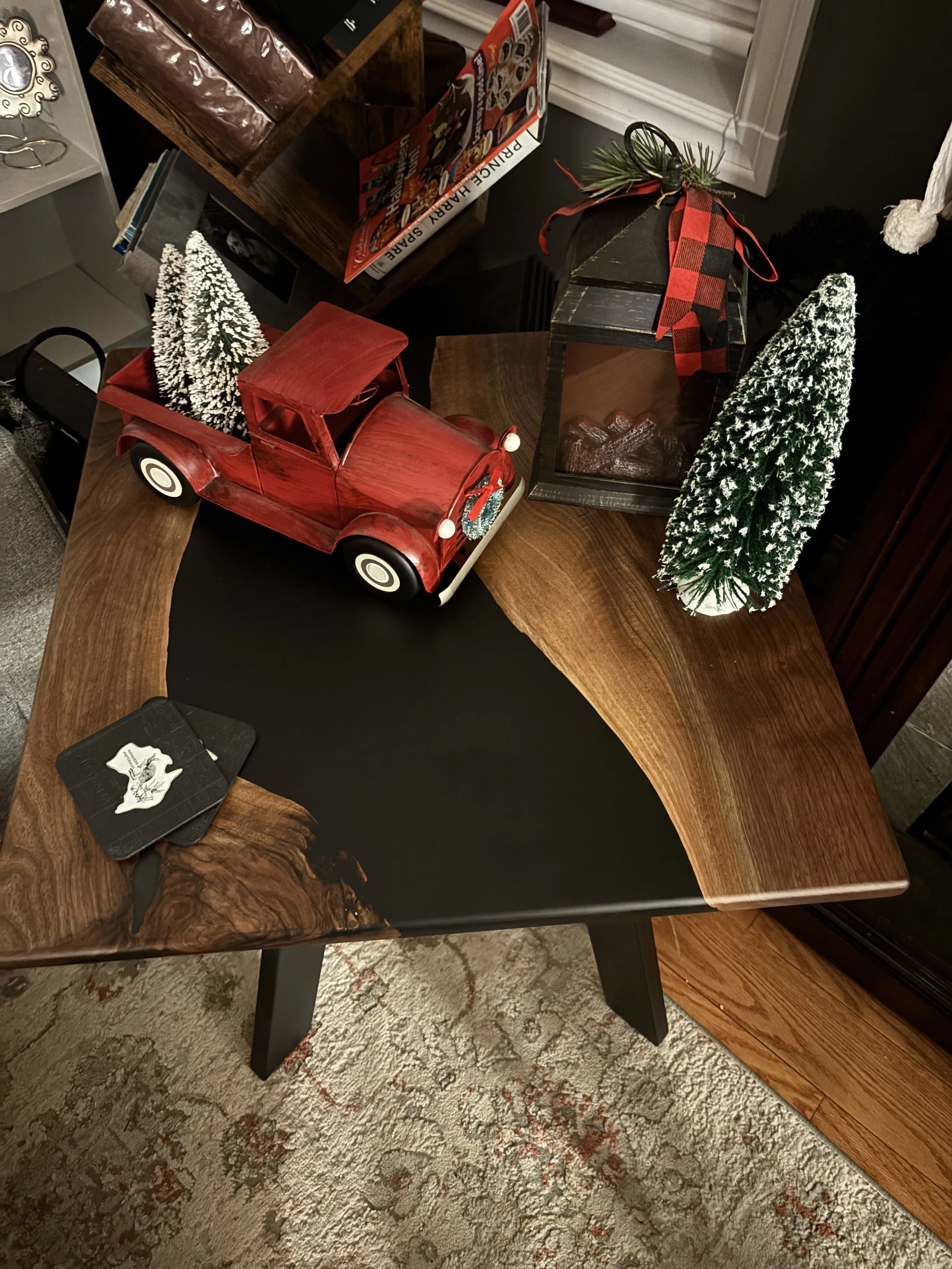 A modern rectangular coffee table with a wood and resin top, featuring a black center and natural wood edges, set against a dark background.