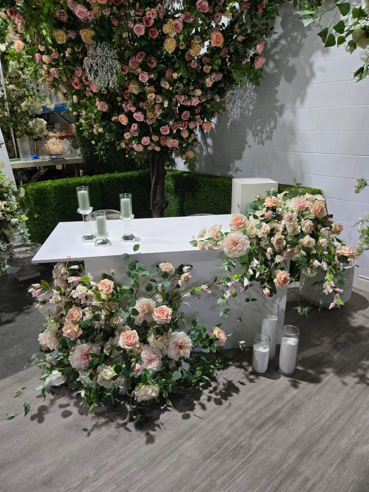 A decorated table with pink and white floral arrangements, candles, and a small tree with pink and yellow roses in an indoor or outdoor setting for a wedding event.