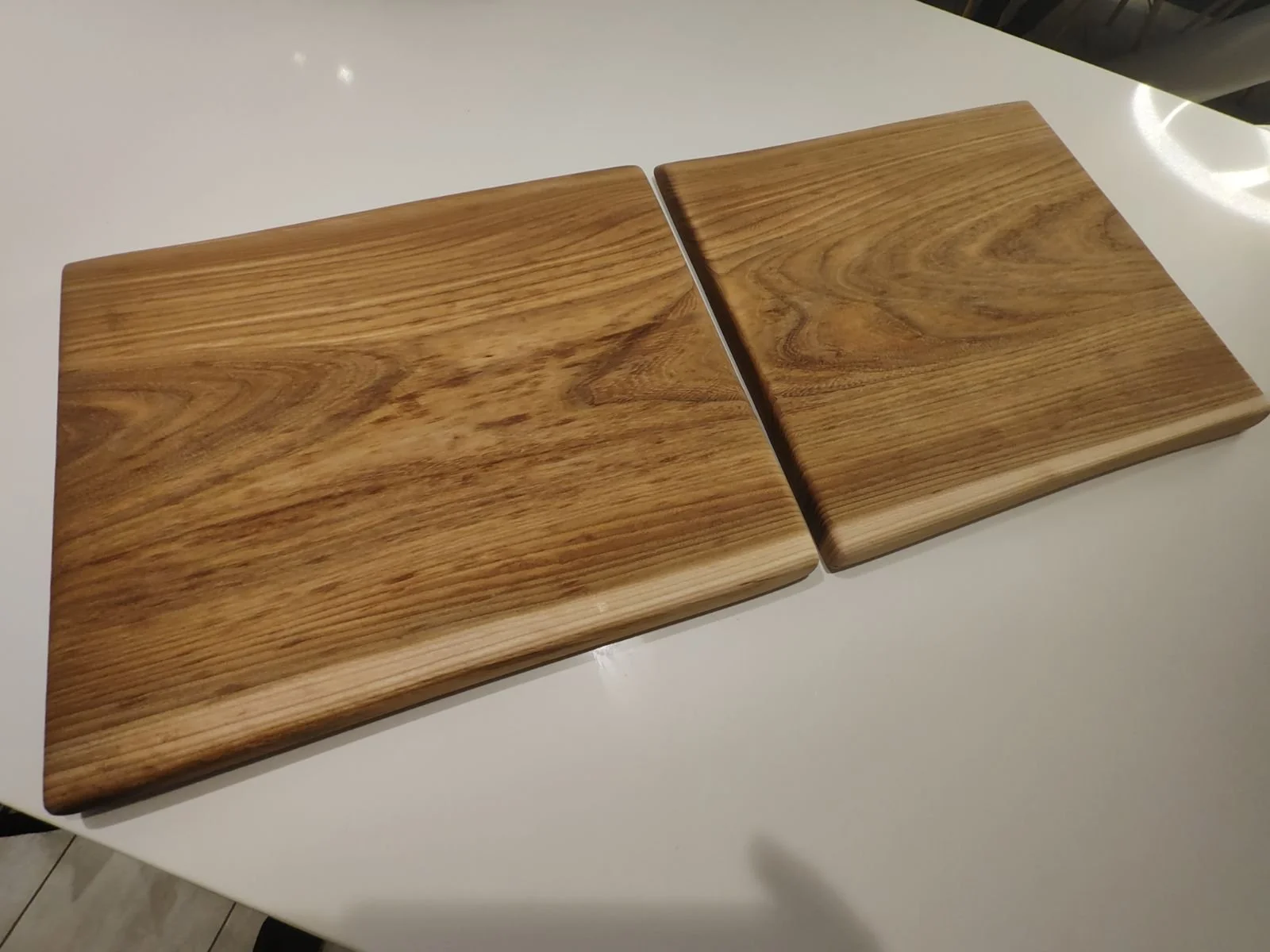 Two wooden cutting boards on a white surface, one larger than the other, both with natural wood grain patterns. View fullsize