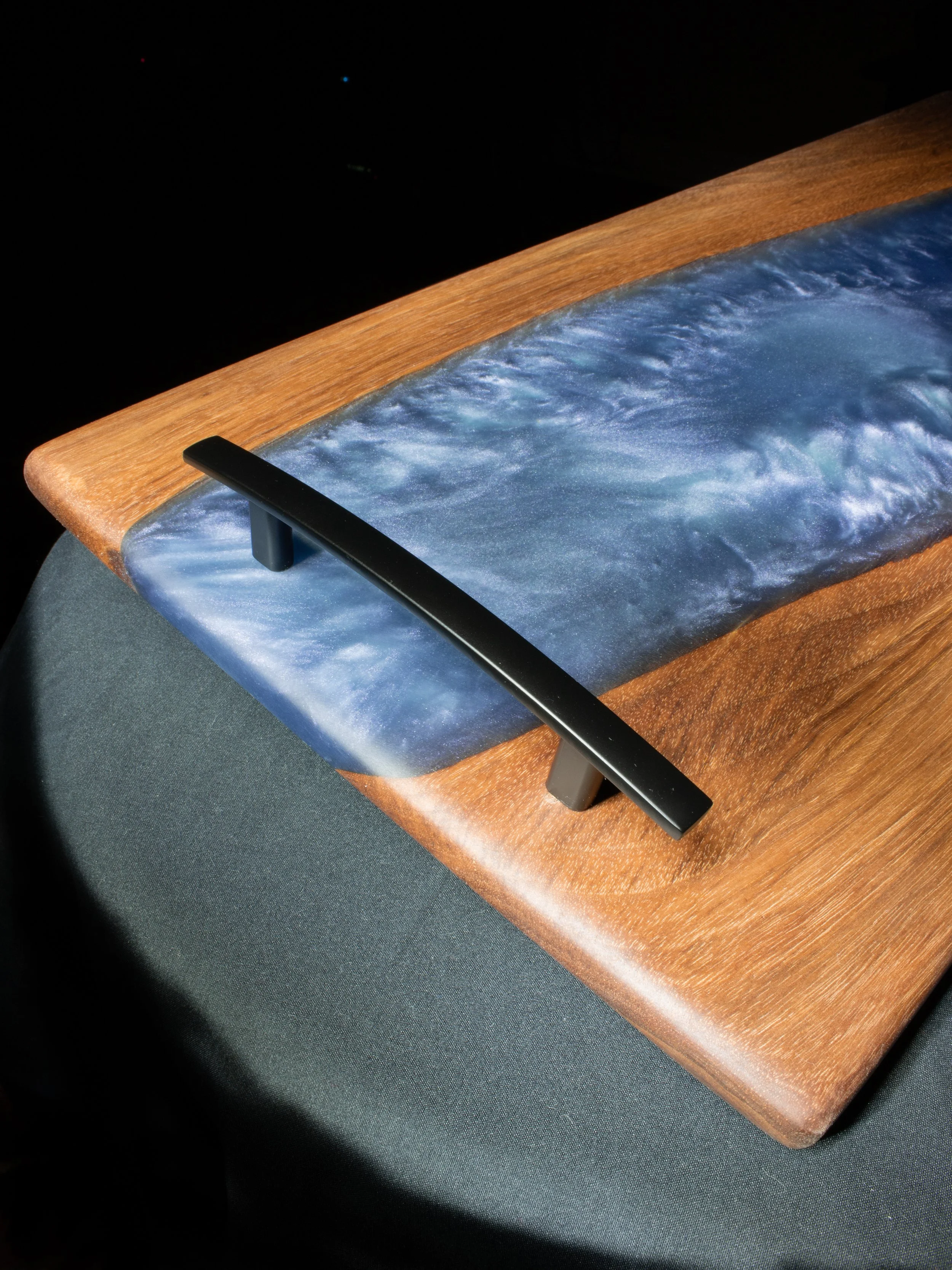 A rectangular wooden tray with a resin river design and black metal handle. View fullsize