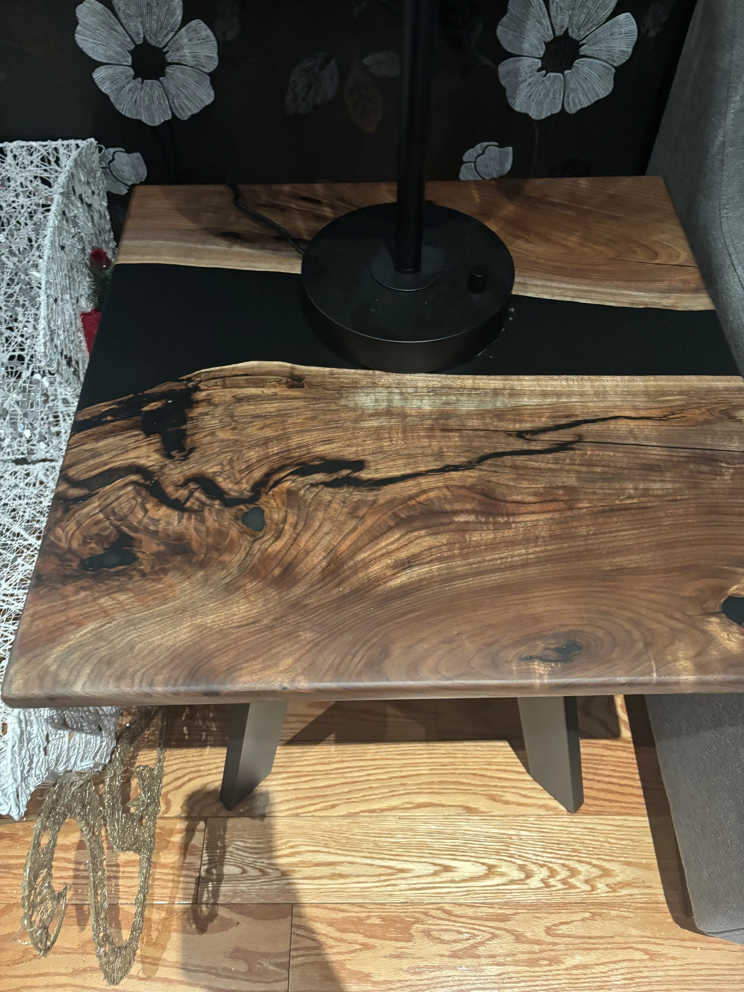 A black epoxy and wooden side table with a natural, irregular wood grain pattern and a black base holding a black lamp. View fullsize